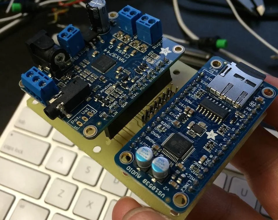 Here is a photo of the audio PCB and the Adafruit Class D amp breakout board and MP3+SD card breakout board: