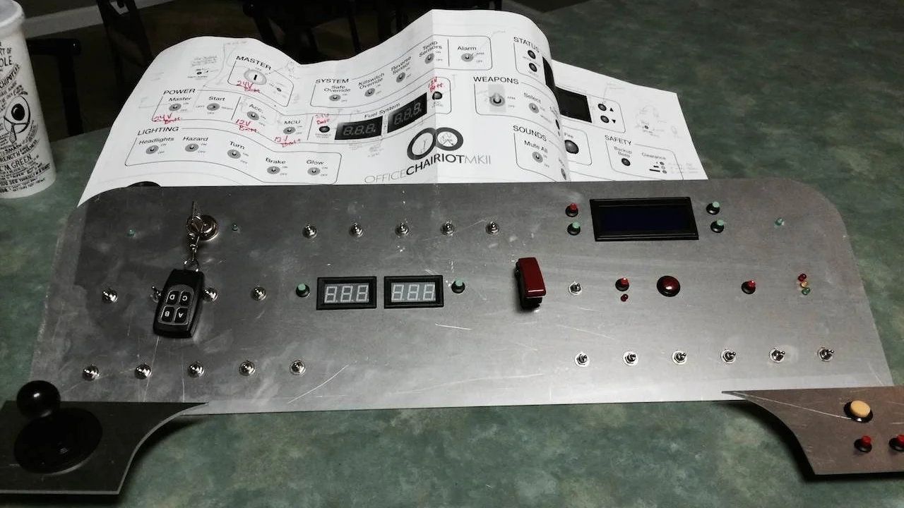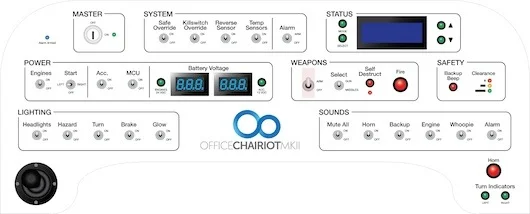 Any of the sound effects on the Office Chairiot Mk II can be customized by simply placing an MP3 on the SD card. Which sound is tied to which effect is configured in the LCD menu system on the control panel and can be done on-the-fly.